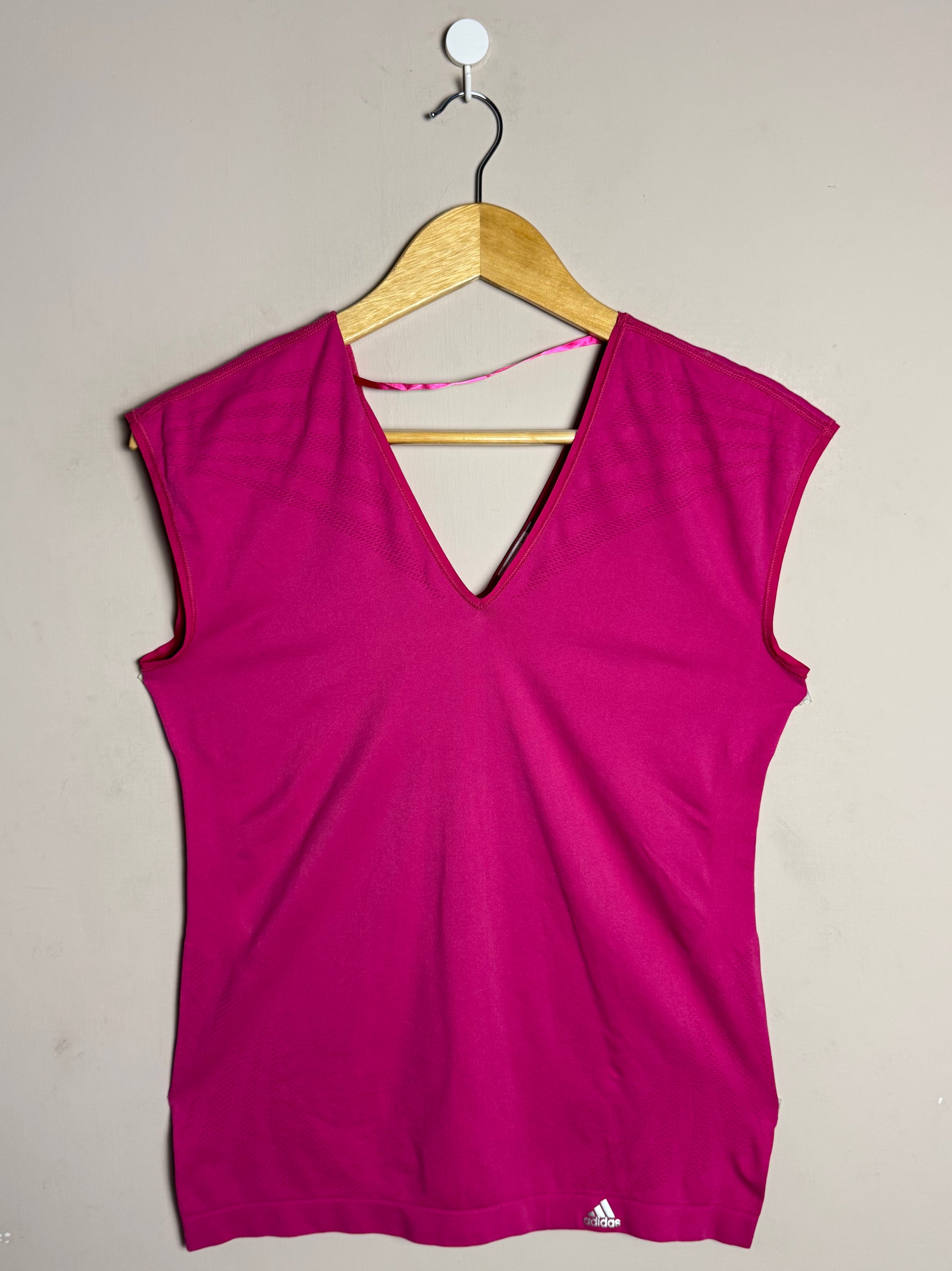 Description: Bright pink Adidas sleeveless V-neck active top made with breathable performance fabric for comfort and style.