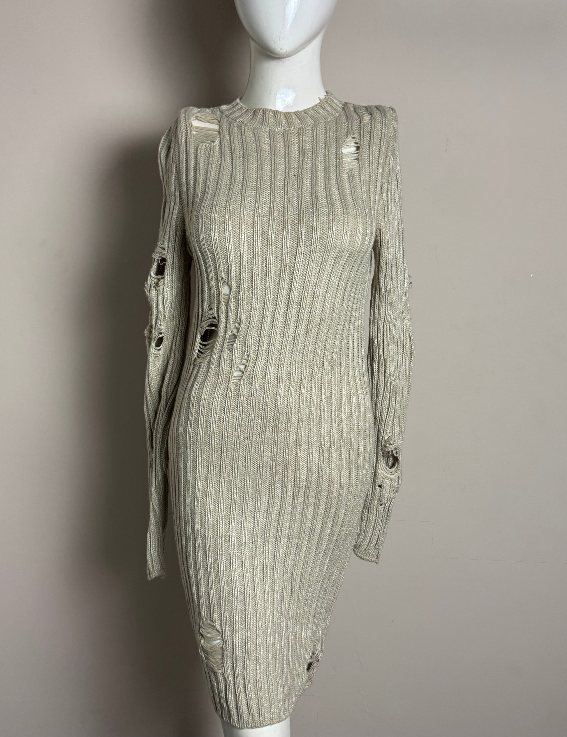 Description: Edgy beige ribbed bodycon dress featuring a distressed ripped design on the front and sleeves, offering a bold and stylish streetwear-inspired look. Made with soft, stretchable knit fabric for comfort and fit.