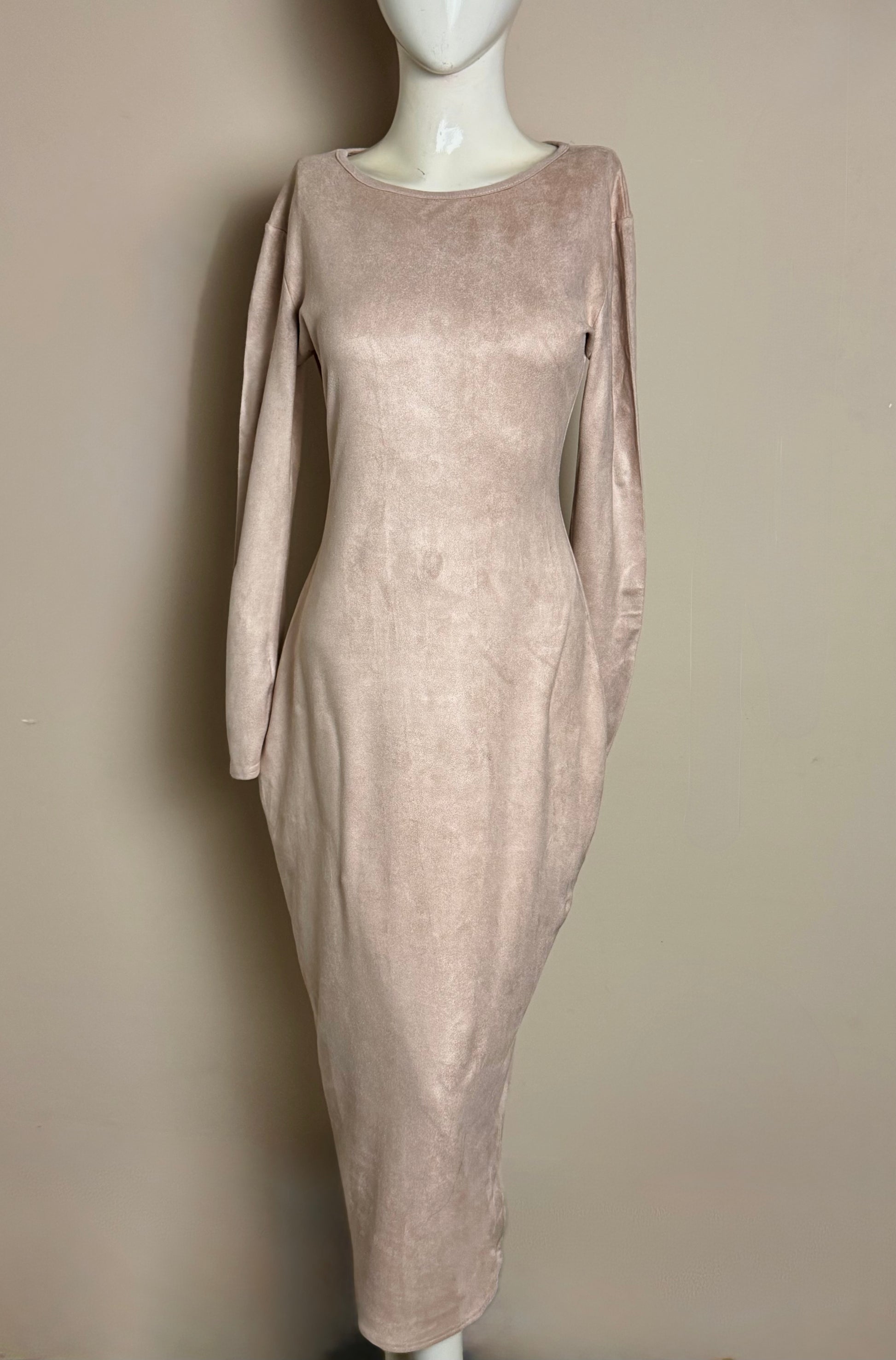 Description: Chic beige velvet midi dress featuring long sleeves, a classic round neckline, and a smooth body-hugging fit. Its soft velvety texture gives a luxurious feel, perfect for evening wear or elegant gatherings.
