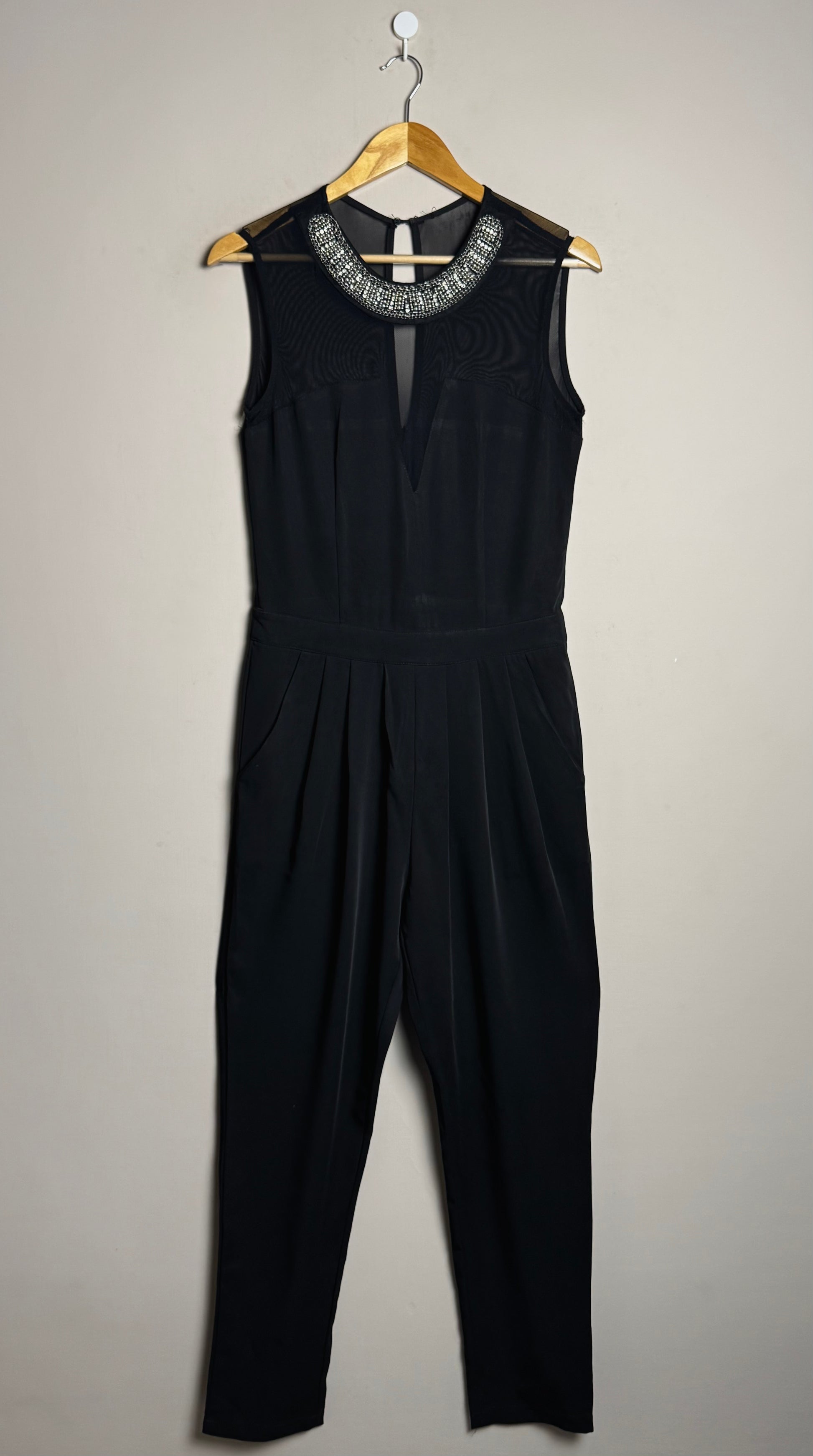 Description: A sleek black sleeveless jumpsuit featuring a sheer yoke and a statement embellished neckline.