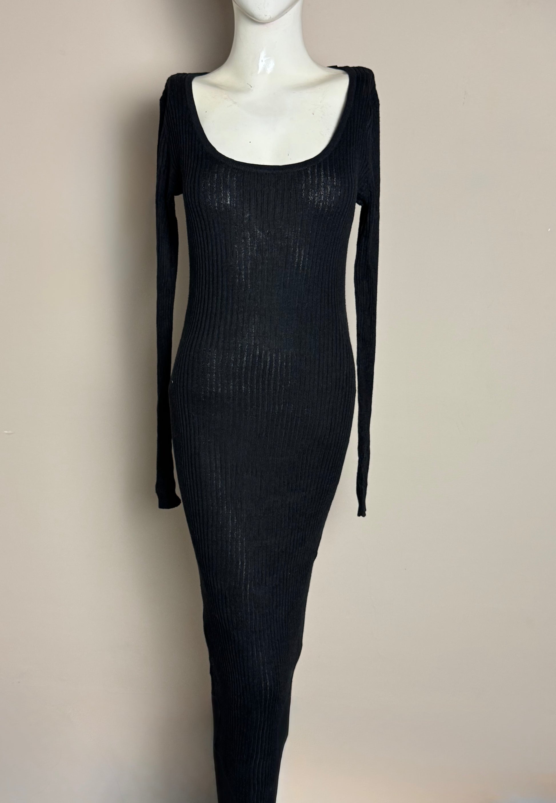 Description: Elegant black ribbed bodycon dress featuring a flattering scoop neckline and full-length sleeves. The soft, stretch-knit fabric hugs the body for a sleek, feminine silhouette — perfect for both casual and evening looks.