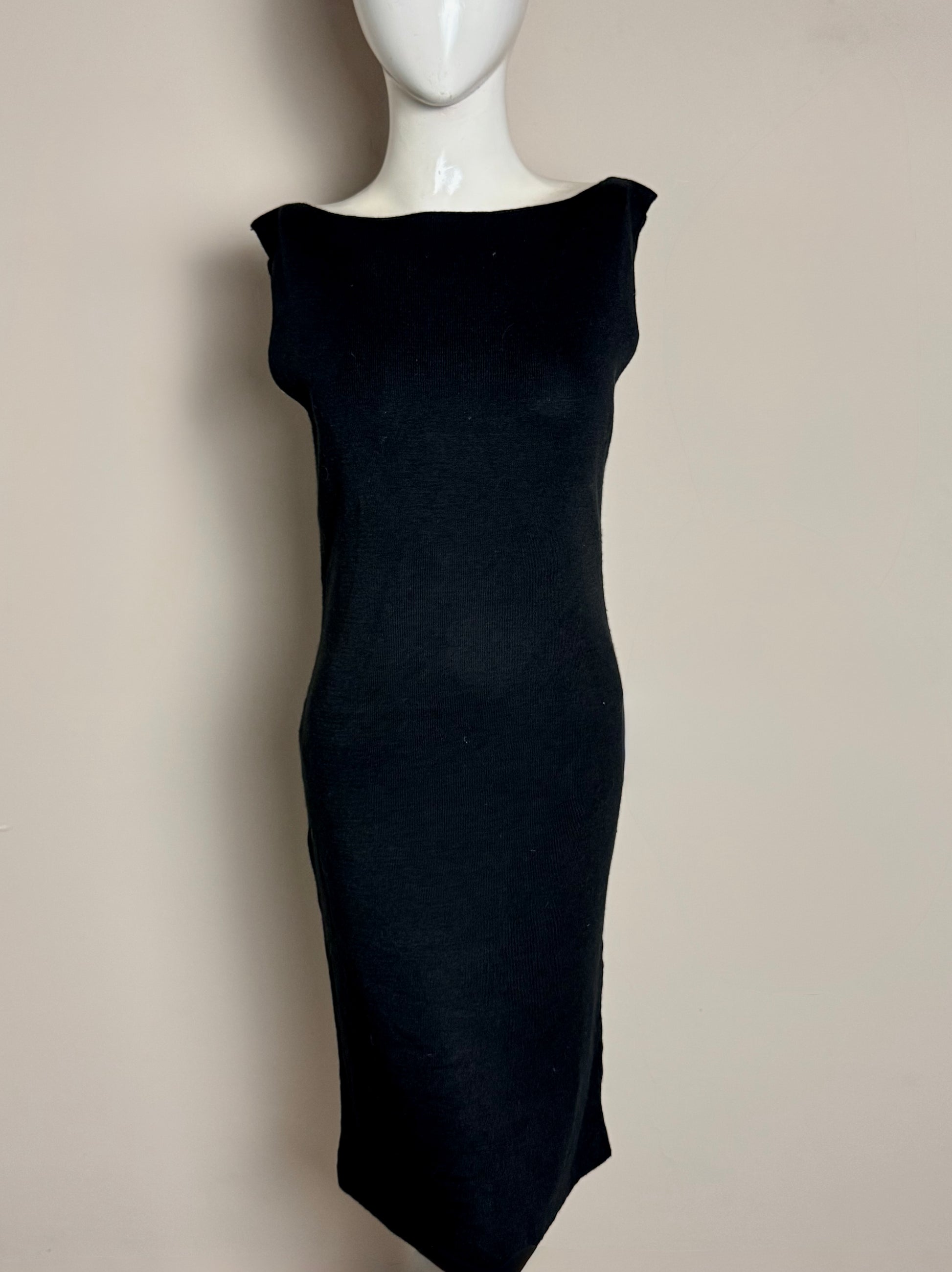 Description: Elegant black sleeveless midi dress featuring a sophisticated boat neckline and smooth stretch fabric. Its minimalistic design highlights the body’s natural shape, perfect for a refined and timeless look.