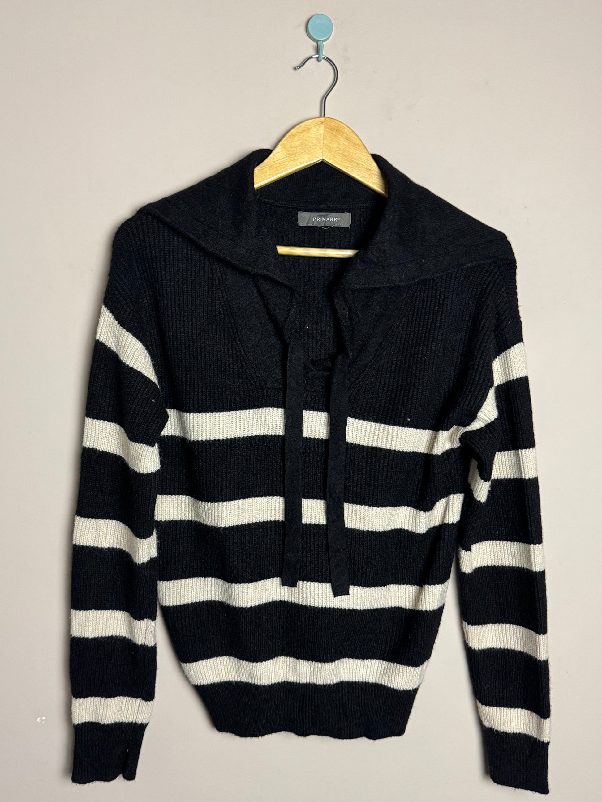 Description: Classic black and white striped sweater with sailor-style collar and front tie detail. Timeless nautical-inspired design.