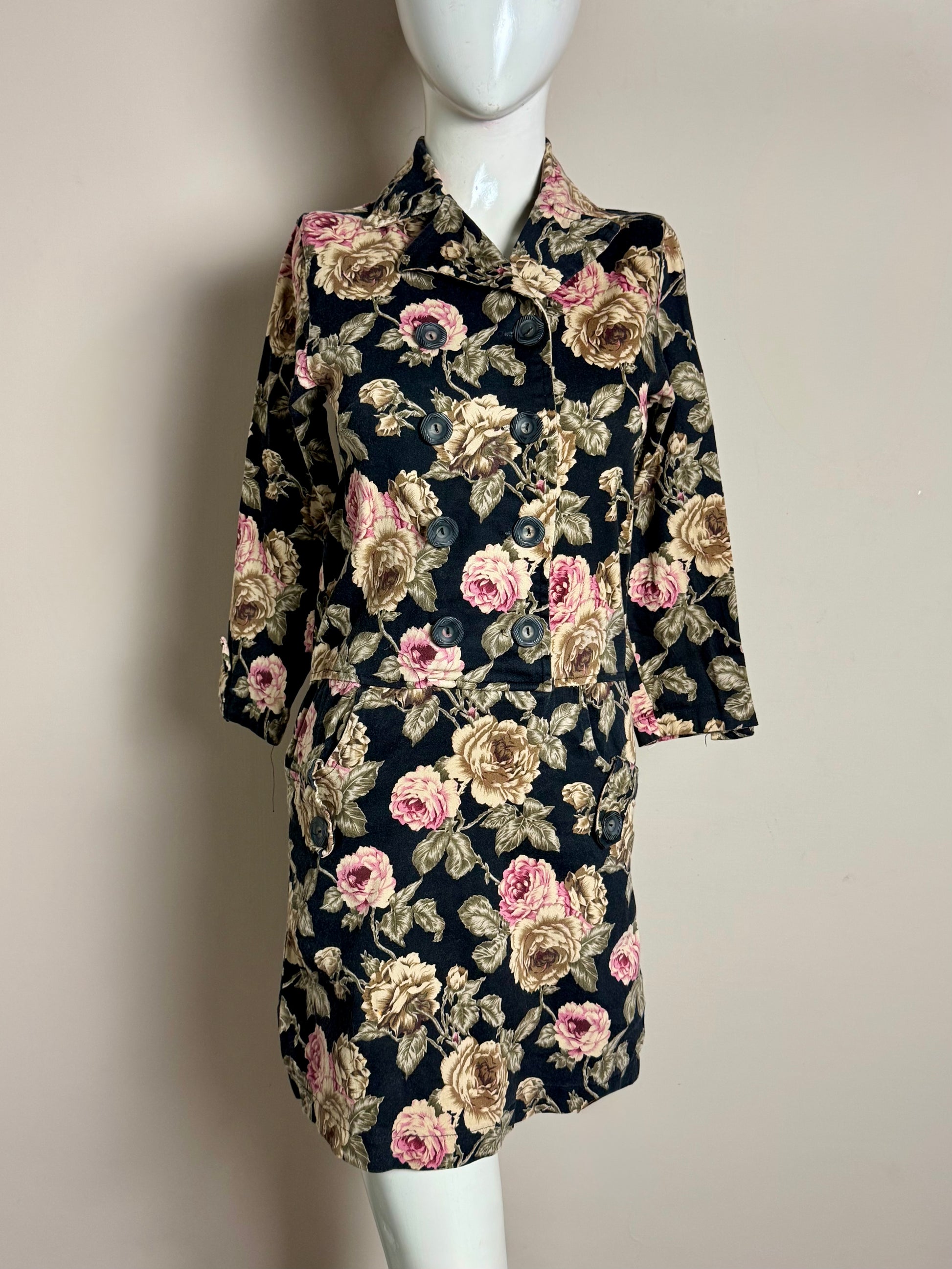 Description: Elegant black mini dress with vintage-style floral print in soft pink and beige tones, featuring a buttoned front and collared neckline. Crafted with a structured yet soft fabric for a refined feminine silhouette.