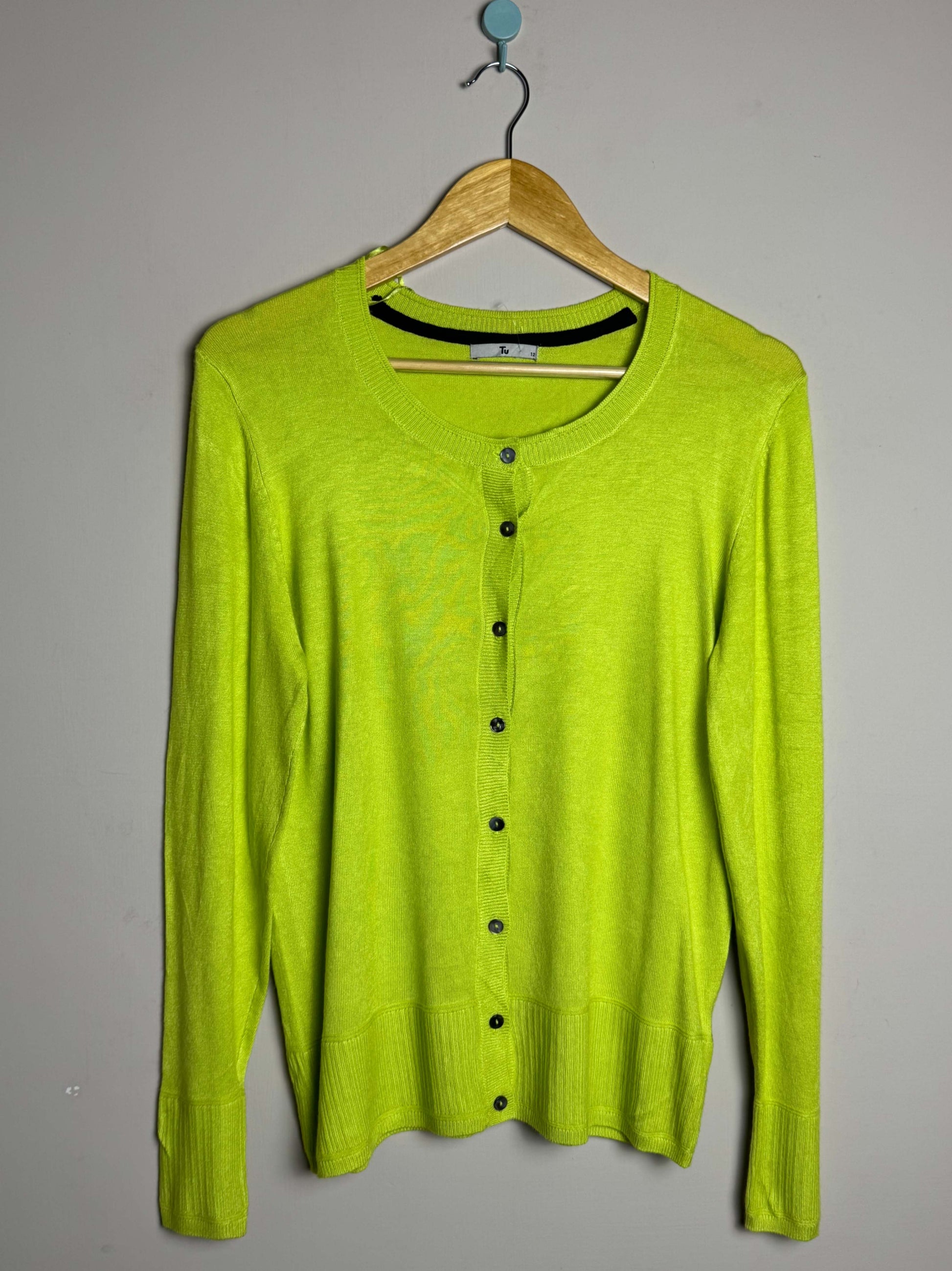 Description: Bright lime green button down sweater with crew neckline and lightweight knit.