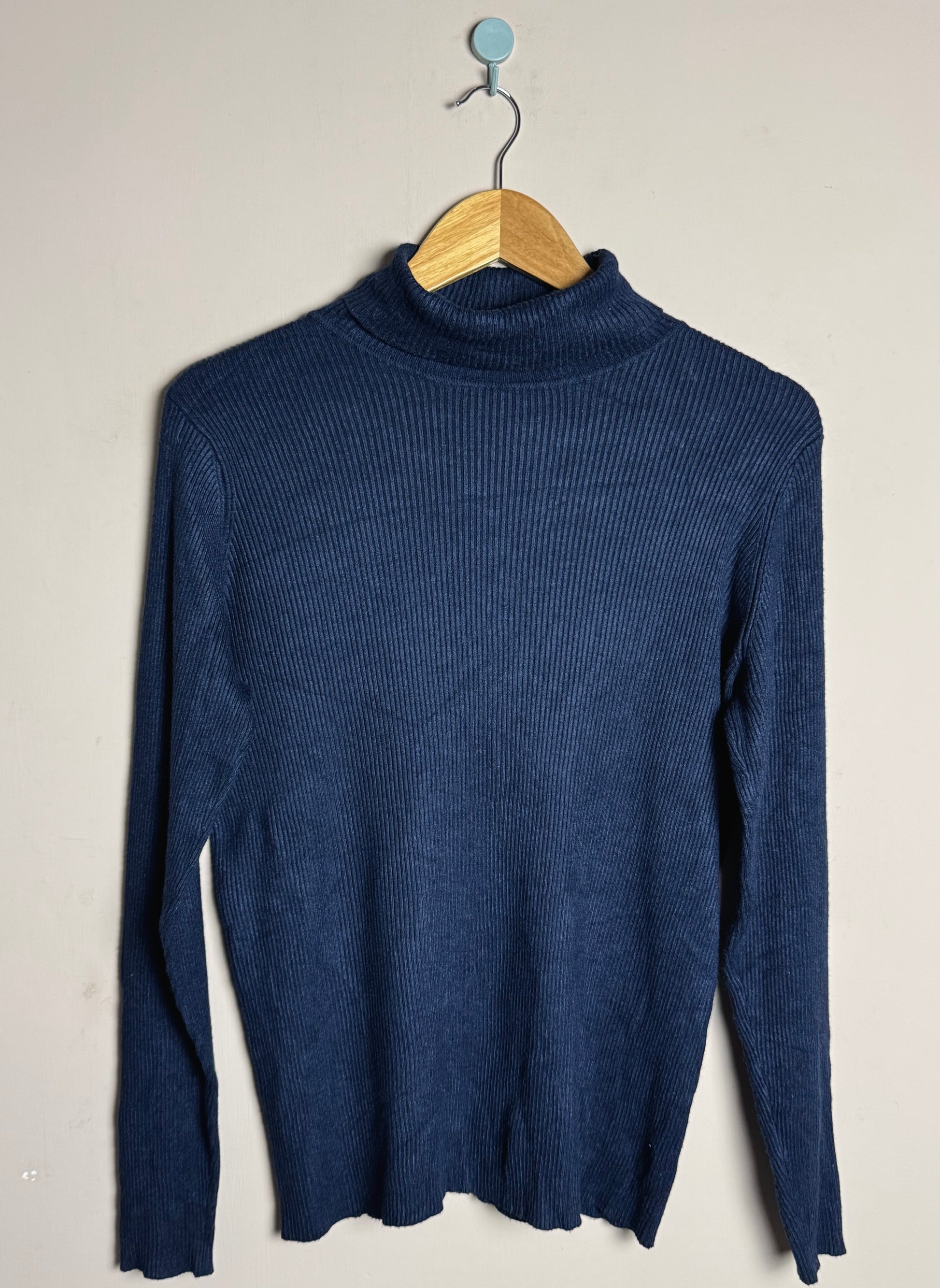 Description: Navy ribbed high neck sweater with a slim fit and stretch for comfort.