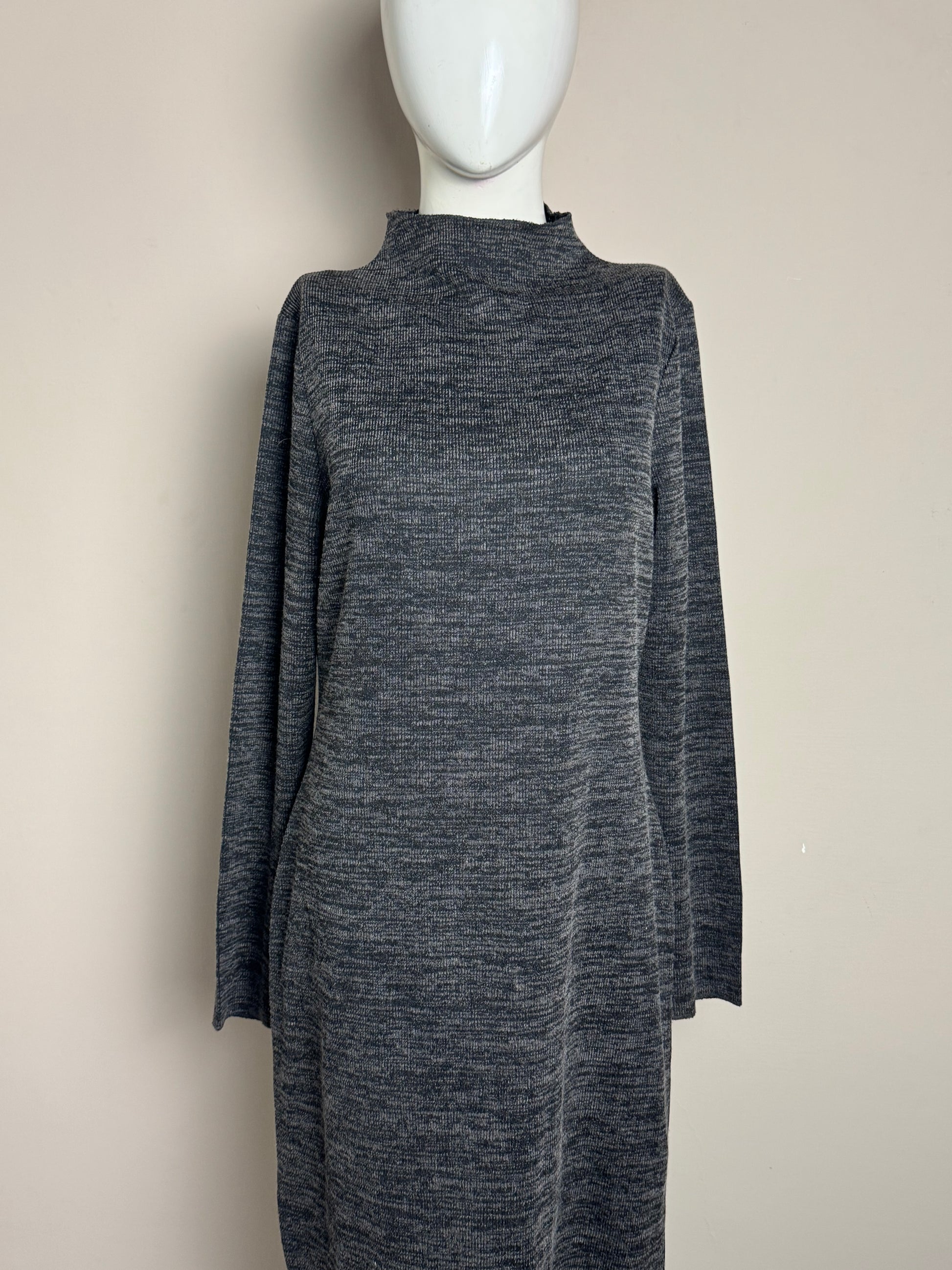 Description: A cozy long sleeve grey knit dress with a high neckline and straight silhouette.