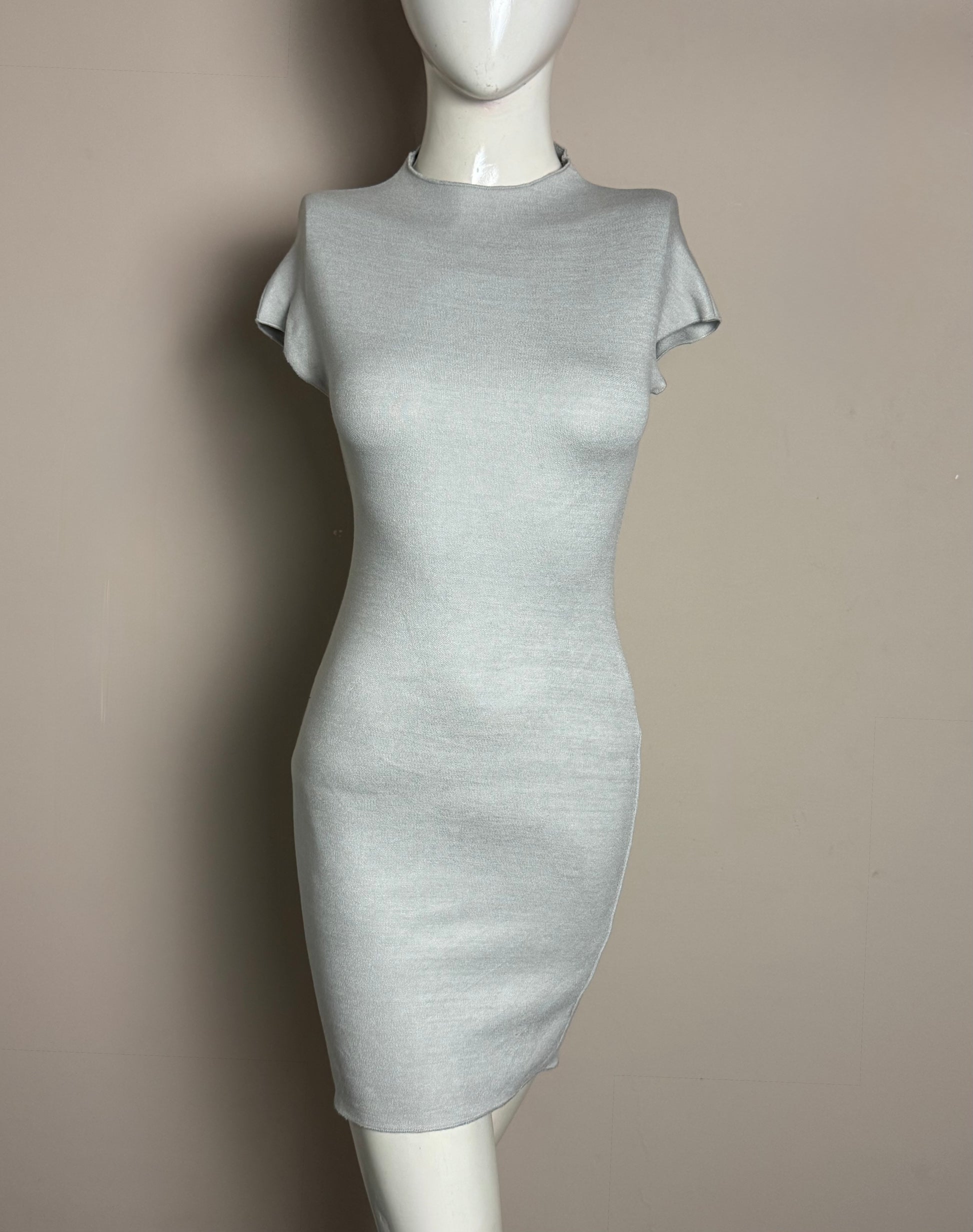 Description: Sleek silver bodycon mini dress with short sleeves and a modern high neckline. Designed from a smooth stretch fabric that highlights the figure, offering a perfect balance of elegance and comfort. Ideal for both day events and evening parties.