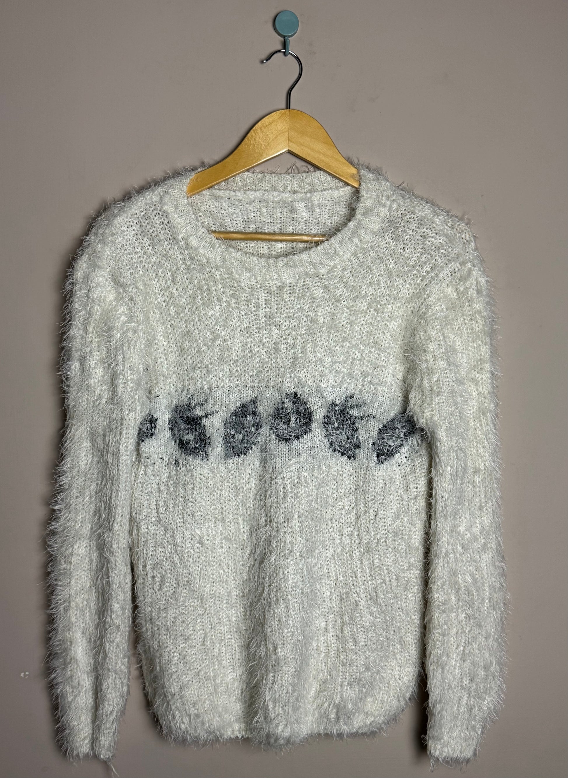 Description: Soft fuzzy white sweater featuring a gray moon phase pattern across the chest. Cozy and warm with a textured knit feel.