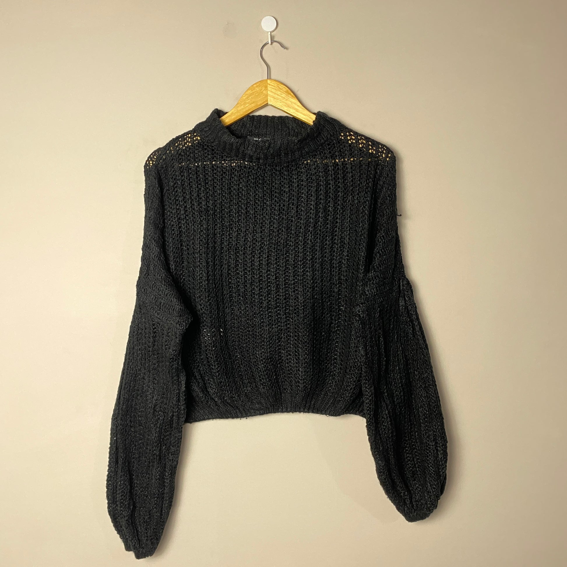 Description: A chic black woolen sweater designed with airy balloon sleeves and a textured knit pattern for a stylish cozy look.