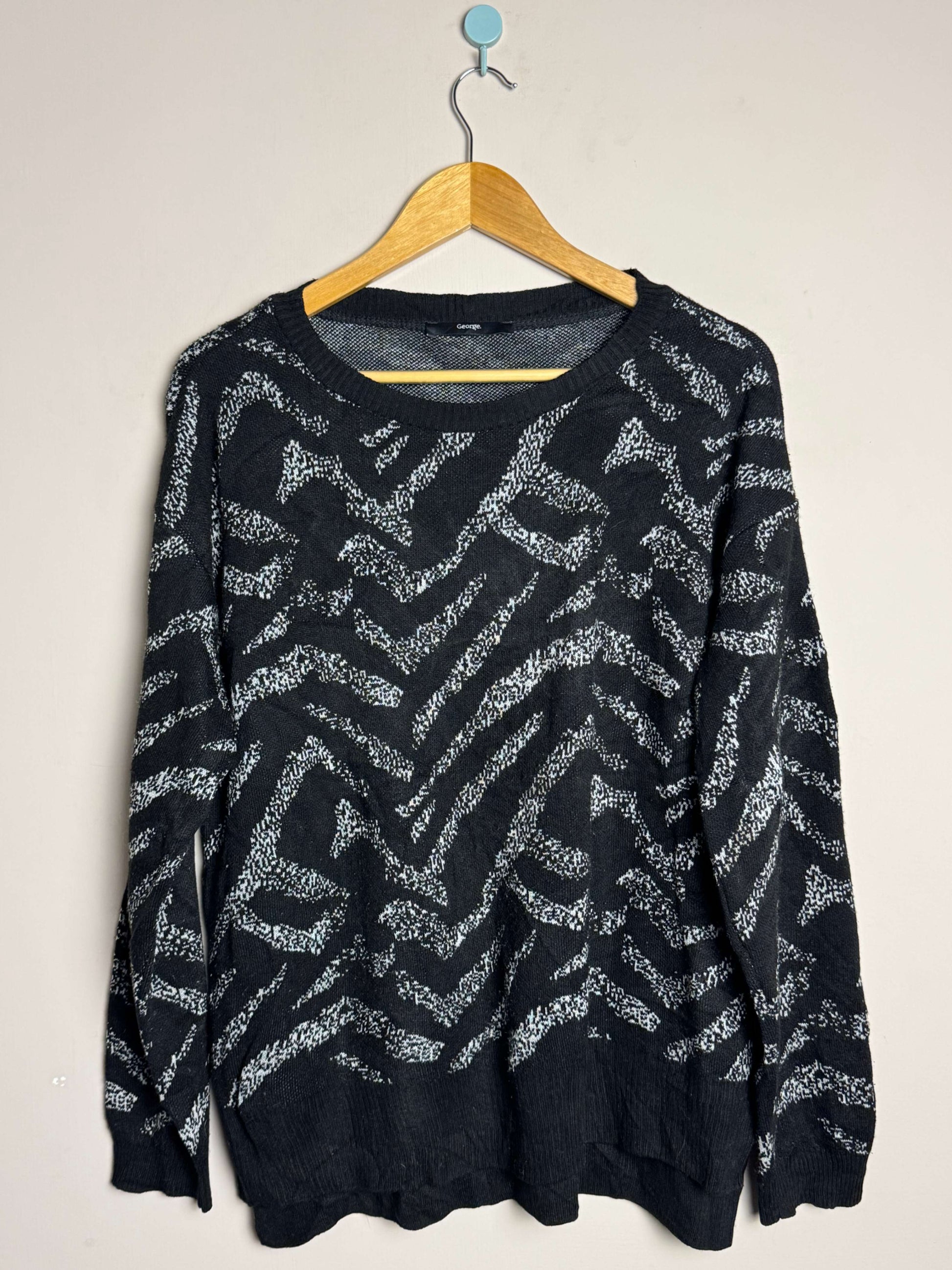 Description: A bold black sweater featuring a striking white zigzag pattern design.