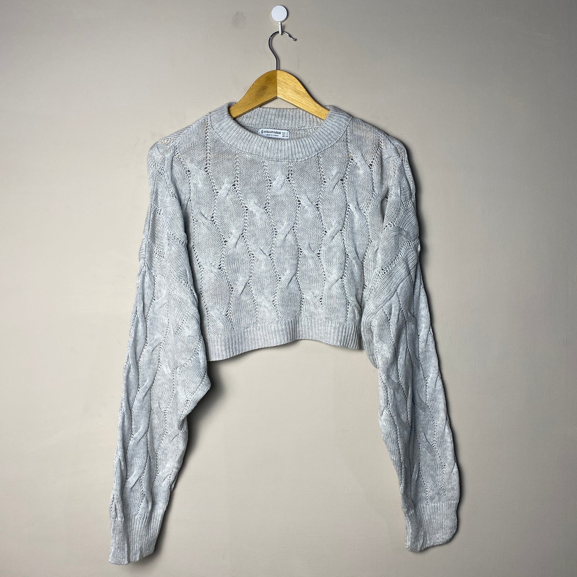 Description: A soft light grey woolen sweater featuring a delicate cable knit pattern with a cropped fit for a stylish cozy look.
