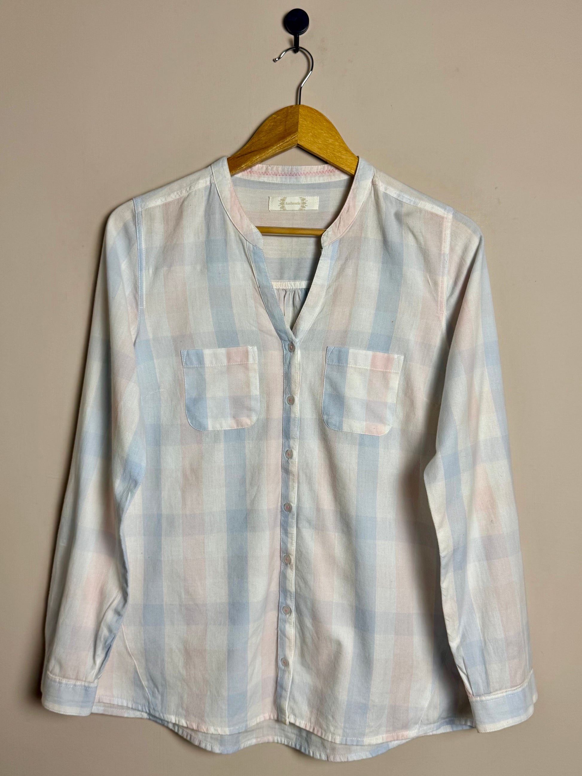 Description: Soft pastel plaid button-down shirt with light pink and blue tones and dual chest pockets.