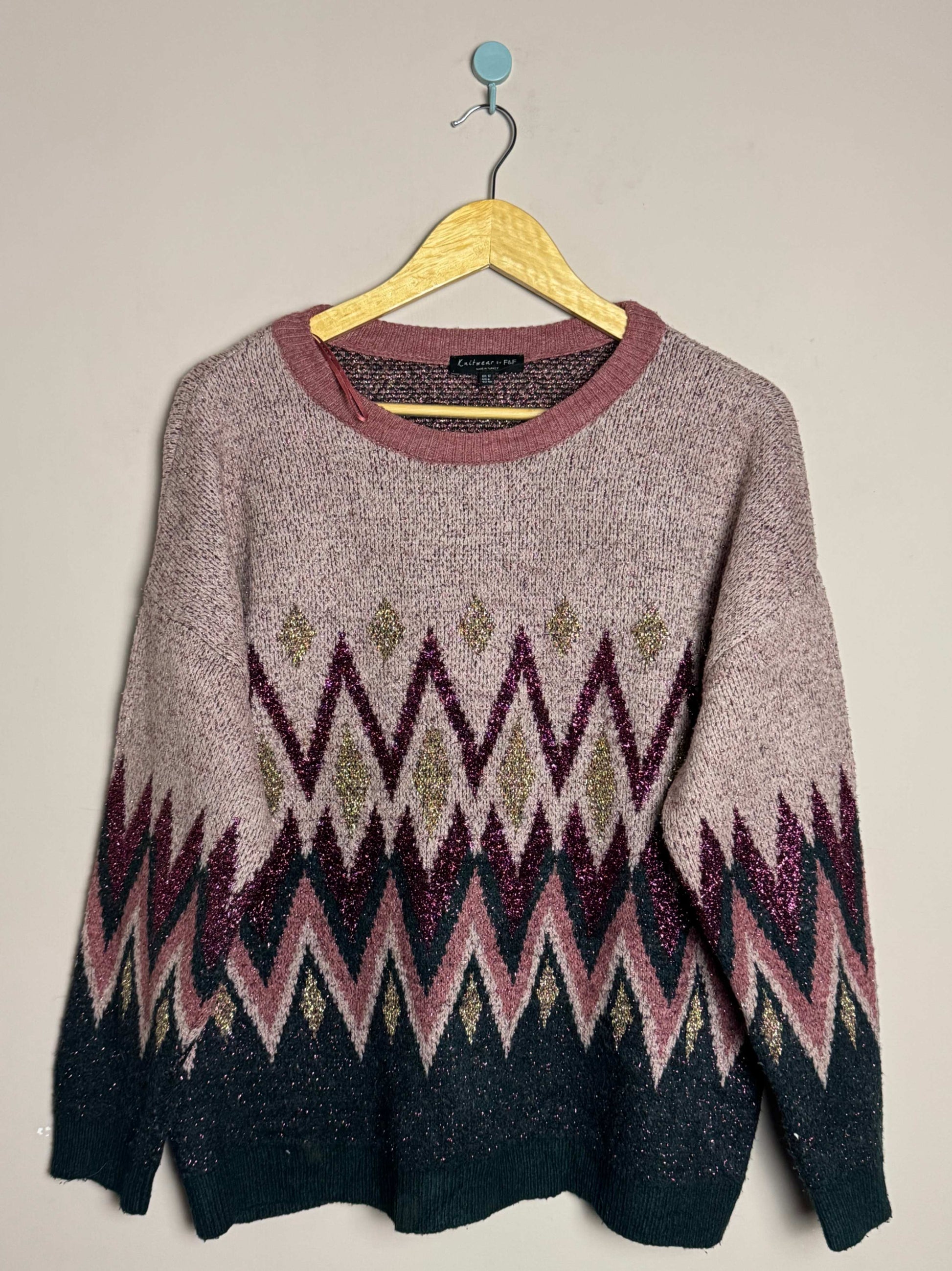 Description: A cozy pink sweater with bold geometric patterns in contrasting colors.