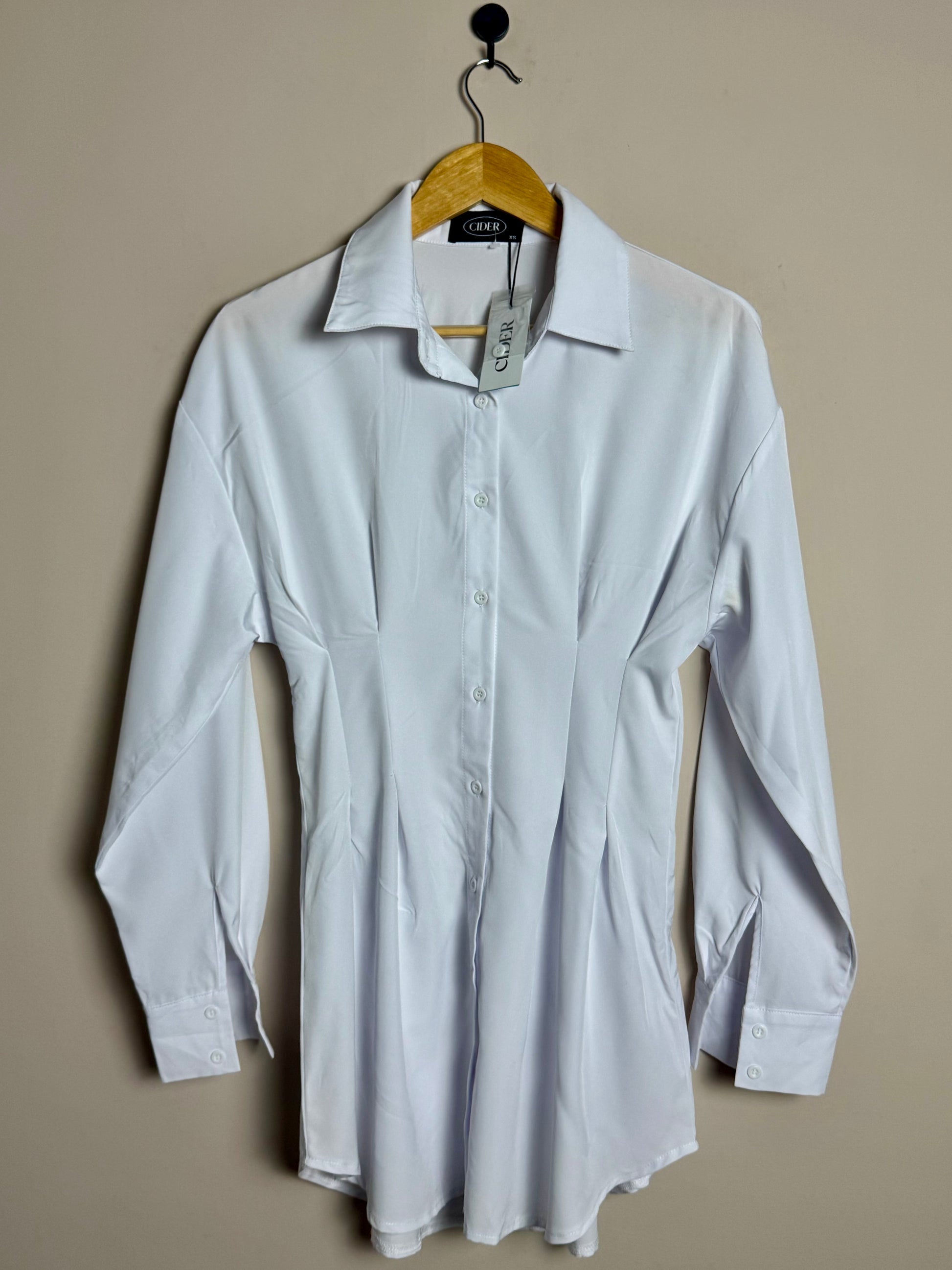 Description: Crisp plain white button-down shirt with tailored fit and long sleeves.